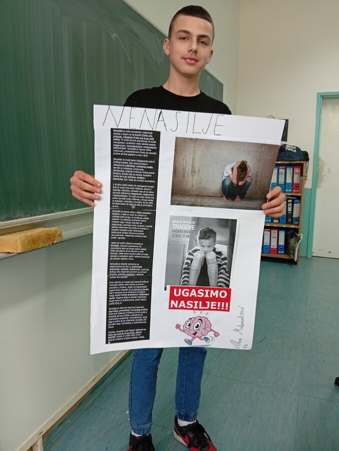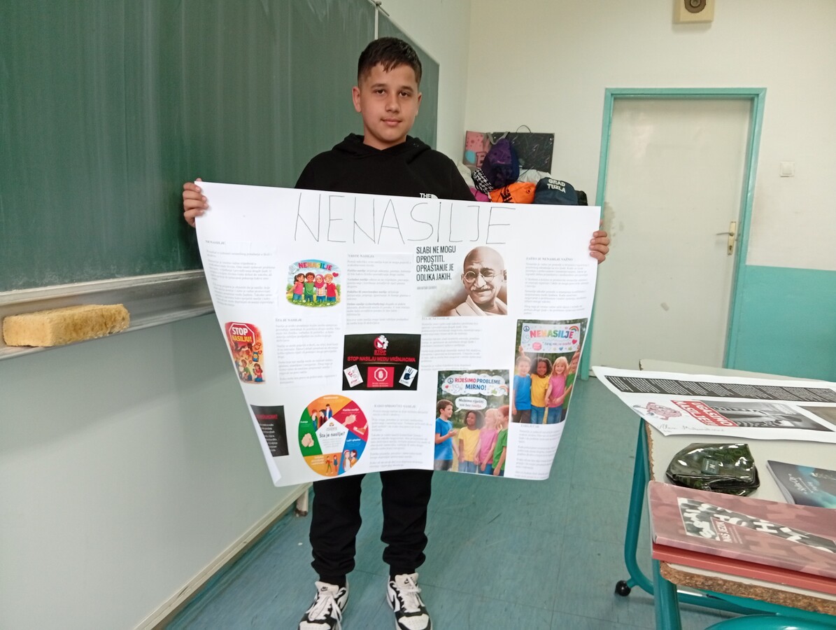 Radionica započinje uvodnim predavanjem nastavnice na temu „Nenasilje“, čime se želi skrenuti pažnja na problem sve učestalijeg vršnjačkog nasilja u školama. Bullying je termin preuzet iz engleskog jezika, ali je i kod nas uobičajen naziv za vršnjačko nasilje. Radi se o konstatnom obliku (fizičkog ili verbalnog zlostavljanja), vrijeđanja ili omalovažavanja pojedinca. Ova vrsta nasilja može imati i svoj suptilniji oblik koji je teže prepoznati, pogotovo ako žrtva pati u sebi, ne govori o tome šta joj se događa. U novije vrijeme se susrećemo i sa specifičnim oblikom nasilja, Cyber bullying, radi se o vrijđanju i ponižavanju putem društvenih mreža na internetu. Nakon kraćeg izlaganja nastavnice učenici Mahmutović Alen i Jusufi David su pripremili panoe o nenasilju te su o tome govorili u razredu.